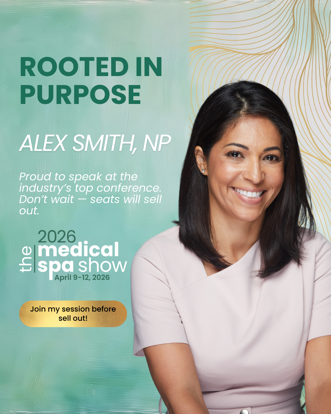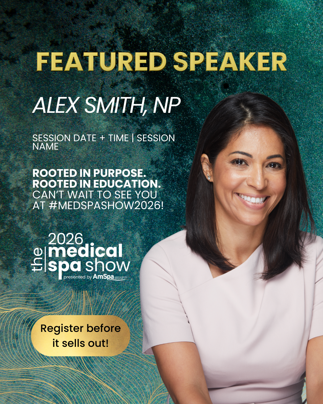 Sample Caption: "Proud to speak at the aesthetics industry’s top conference in April. Rooted in purpose and committed to elevating education for our entire community. Secure your spot before the show sells out, see you at #MedSpaShow2026."